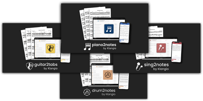 The Klangio Transcription Apps are specialized AI-powered tools designed for musicians who want to convert their instrument performances into readable and editable notation. Each app (Piano2Notes, Guitar2Tabs, Sing2Notes, Drum2Notes, Wind2Notes, and Violin2Notes) is optimized for its respective instrument, using dedicated machine learning models that analyze recordings and identify the played notes even when multiple instruments are present in the mix.
