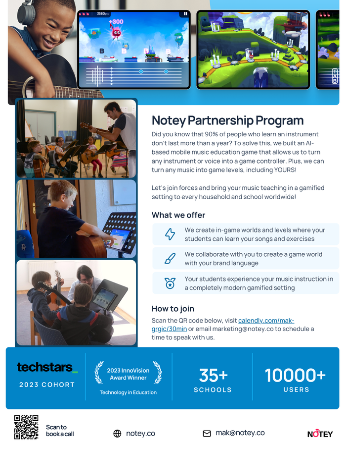 90% of people who learn an instrument don’t last more than a year. To solve this, we built an AI based mobile music education game, powered by our proprietary ML audio engine that allows us to turn any instrument or voice into a game controller. Utilizing generative AI for fully dynamic level generation based on player's music learning deficiencies, allowing full scale user content customization, we are using our 4 patent-pending technologies to cultivate a series of games that combine music practice and gaming in an immersive setting.